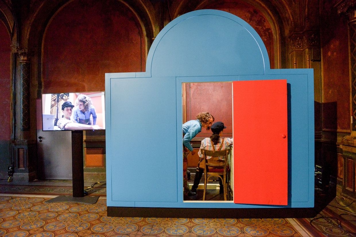 Gespielt wird treppauf und -ab auf allen Ebenen, derweil die Zuschauer auf den Stufen platznehmen und per Live-Kamera mit dem Geschehen aus den anderen Stockwerken versorgt werden. Die farbflächig-bunten Bühnenbilder – unter anderem gibt es eine formidable Spiegel-Show-Drehtür – setzen nochmal eine eigene Welt in das ohnehin schon aus der Zeit gefallene, morbid-charmante Galerie-Universum. Die Brüche und Reibungen in Raum und Spiel nimmt Christian Decker (Fury-Bassist und seit dieser Spielzeit hannoverscher Schauspielkapellmeister) musikalisch geschickt auf. Allein schon die Titelmelodie behauptet frech fette Dramatik und erzählt von großen Dingen, die da kommen werden: