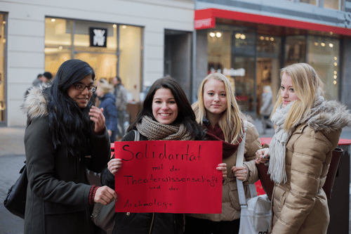 Am 14. April um 19 Uhr findet die nächste Vollversammlung Theaterwissenschaft im Hörsaal des Institutes statt, Studenten und Lehrkräfte arbeiten an einer großen Performance, zum Campusfest Anfang Juni werden die Schließungen natürlich auch Thema sein und – das ist zwar noch ein bißchen hin, aber vormerken sollte man sich den Termin schon mal – am 25. Juni ist eine große Demonstration geplant.