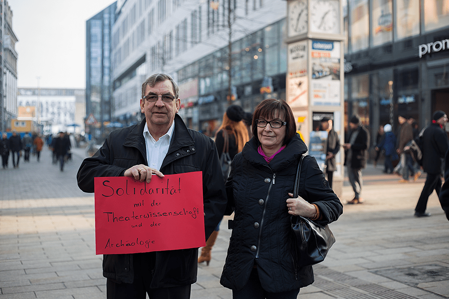 Der Protest mag – ob dem, was auf dem Spiel steht – einigen zu klein erscheinen, aber er geht weiter. Informieren könnt ihr euch auf im » Blog der Fachschaft, im » YouTube-Channel gibt es Unterstützung aus Italien, Japan, von Volker Lösch und Armin Petras im Video und mittlerweile zeigt ein » Tumblr viele, viele Leipziger, die den Protest unterstützen, im Bild: