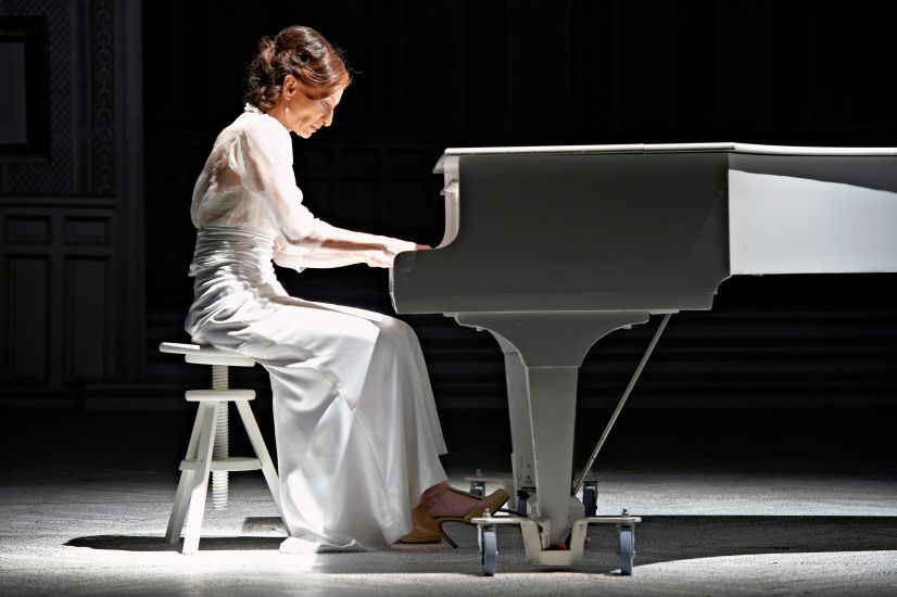 Hier gibt es gleich Krieg? Die Zuschauer empfängt ein großbürgerlicher Salon – beinahe ein Ballsaal – leer; bis auf einen weißen Flügel in der Mitte. Leer ebenso die unzähligen Bilderrahmen an den Wänden. Natürlich bleiben weder Raum noch die weißberobte Pianistin lange sauber und rein, wenn der Intendant zur Saisoneröffnung Erich Maria Remarques Anti-Kriegs-Klassiker auf die Bühne bringt.