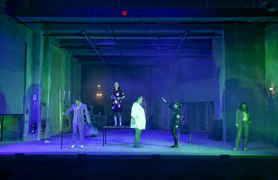 Die Ouvertüre vorm samtigen Vorhang scheint unschuldig auf hohe Theaterkunst im gediegenen Ambiente einzustimmen. Aber kaum öffnet sich letzterer, finden wir uns in einem Provinz-Betonkeller wieder, wie man sich ihn trister schwer vorstellen kann. Hier – sozusagen im Upside Down des imaginären Utzbach – findet sich der große Staatsschauspieler Bruscon wieder. Der ist auf Provinz-Tournee mit seinem eigenen Stück, einem Werk, das nicht weniger sein will als die Komödie aller Komödien. Das einzige, was das Theaterglück stört, sind die anderen: allen voran Gattin, Sohn und Tochter, die seiner Ansicht nach talentlosesten Schauspielern ever; das Publikum, die Kritiker und der Utzbacher Brandschutzbeauftragte, der die Löschung des Notlichtes verwehrt.
