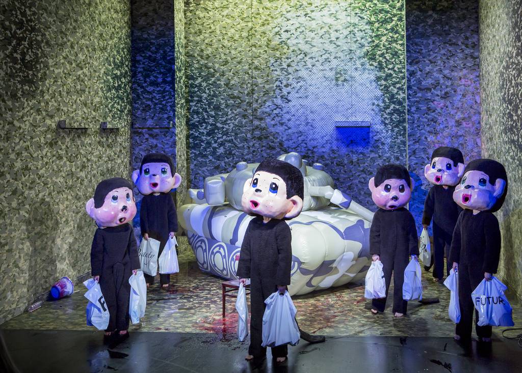 Davor die fünf Texte Heiner Müllers, poetisch und klug und von Regisseur Philipp Preuss wunderbar gesetzt in den Tarn-Raum, der die Hinterbühne einnimmt. Von dessen Wänden sich die Spieler in Tarnanzügen lösen, um ihrer Geschichten – mal im Chor, mal einzeln – mehr zu sprechen, denn zu spielen und sich zu starken, ganz unterschiedlichen Bildern wieder zusammenfinden. Daniela Keckeis als menschliches Maschinengewehr, Denis Petkovic als zweifelnder Hauptmann, das Ensemble als Soldaten-Kompanie, der der Gleichschritt nicht gelingen will und wieder alle beinah wie ein Gemälde dasitzend – als Hommage an Müller inklusive (Luft)Zigarren und reichlich Bühnennebel, während der Meister selbst vom Band das absurde Centauren-Stück liest.
